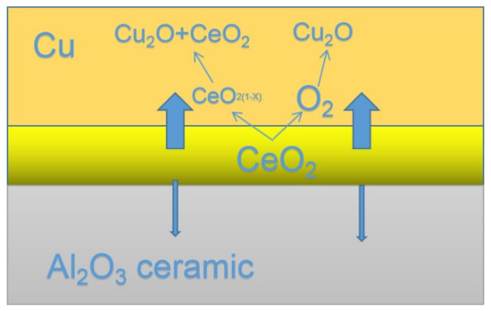 - CeO2 nanoparticles coated on the surface of the Al2O3 ceramics can easily diffuse into the metallic Cu layer, but they do not in Al2O3 ceramics. CeO2 nanoparticles can accelerate to form the eutectic liquid of Cu2O–Cu, as they have strong functions of storing and releasing O at an Ar pressure of 0.12 MPa;