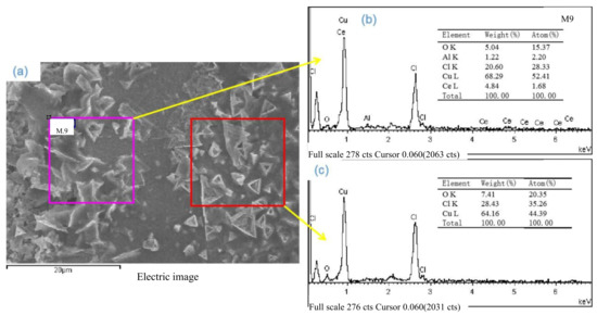 The reaction temperature of 1300 °C is 65 °C higher than the melting point of Cu2O (1235 °C). Thus, Cu2O reacts rapidly with Al2O3 to form compounds of CuAlO2 at the interface in only 5 min. The formation of these low melting point copper oxides and interfacial compounds (CuAlO2) is beneficial for the liquid phase copper wetting of the alumina ceramic (melting point of CuO is 1200 °C). Under certain conditions, CeO2 is decomposed at 1000 °C and easily diffuses to the Cu layer, accelerating the formation of the CeO2–Cu2O–Cu eutectic, as shown in Figure 9. Figure 10 shows the SEM images and EDS of the interface. A strong structure, which is the key to strengthening the bonding interface, is formed due to the triangular type of the Cu2O, and Y type of CeO2 and CuAlO2.