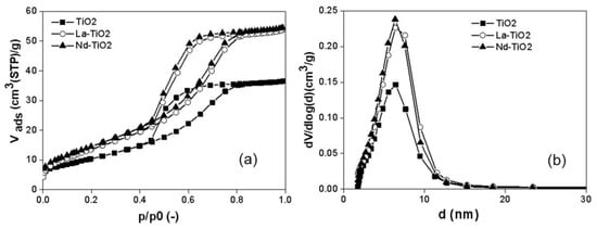 The nitrogen adsorption–desorption isotherms of the materials showed a similar shape (IV type of the IUPAC classification, Figure 1a), which corresponded to the mesoporous character of all investigated materials with negligible participation of microporosity. The nitrogen physisorption showed an increasing specific surface area with lanthanum or neodymium loading in the photocatalyst (Table 1). The pore size distribution also (Figure 1b) confirmed the trend of increasing specific surface area. The increased specific surface area after the addition of lanthanum was in agreement with the literature [,]. The increased specific surface area was explained by Liu et al., who claims that La2O3 easily occupy defect sites on the surface of anatase particles and prevents the transformation of anatase to rutile and increases the grains.