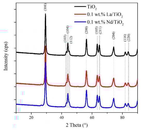 The XRD patterns of pure TiO2, La/TiO2, and Nd/TiO2 are shown in Figure 3. All diffraction lines were assigned to the presence of the tetragonal modification of TiO2 anatase and corresponded to characteristic planes by the International center for diffraction data (ICDD) PDF card no. 00-021-1272 (space group I41/amd and lattice constants a,b = 3.7852 Å and c = 9.5139 Å). The detected anatase reflections were marked with appropriate (h, k, l) symbols. An additional polymorphic form of TiO2 as well as Nd or La related phases (oxide forms) as impurities were not identified. This indicates a high dispersion of a small amount of La/Nd oxide. The refined lattice parameters, cell volumes, and crystallite sizes are shown in Table 2. It is clear that the addition of lanthanides reduced the crystallite size of the final photocatalyst, suggesting that lanthanides prevent agglomeration. Similar results have been previously reported [].