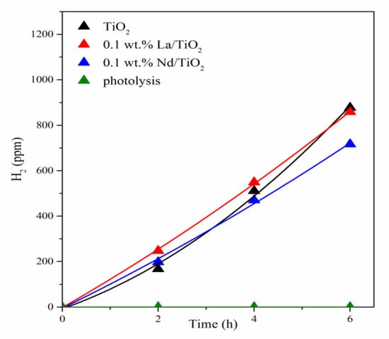 The hydrogen production from the photocatalytic decomposition of NH4OH is shown in Figure 4. All prepared photocatalysts produced significantly higher amounts of hydrogen than in the case of photolysis. The 0.1 wt.% La/TiO2 possessed a slightly higher yield of hydrogen than the 0.1 wt.% Nd/TiO2. For TiO2, the yield of hydrogen was similar to 0.1 wt.% Nd/TiO2 at the beginning of the reaction and was slightly higher after 4 h. All catalytic tests were measured repeatedly.