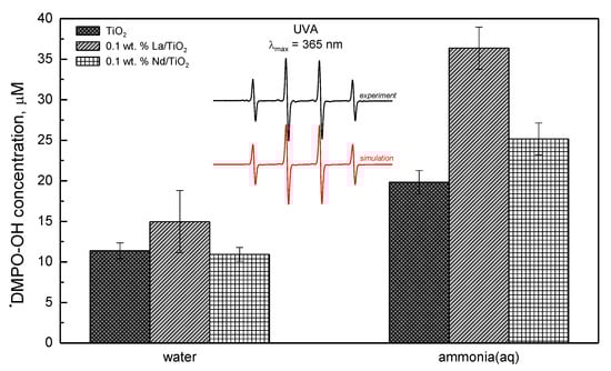 Figure 5 represents the concentration of the •DMPO–OH spin-adduct evaluated from the integral intensity of the EPR signal upon 330 s UVA exposure (radiation dose 5.9 J cm−2) in the ammonia-free aqueous titania suspensions, in comparison with the data obtained in the presence of ammonia. Comparable concentrations of •DMPO–OH were found using pristine and doped TiO2 photocatalysts in ammonia-free systems, evidencing only a limited effect of doping. Theoretically, the photocatalytic oxidation of NH3 in TiO2 suspensions in the presence of oxygen includes the formation of various intermediates, which may react with •OH in the complex competitive reactions and such a process reflects in the decrease in the •DMPO-OH concentration. However, in our experiments, the presence of ammonia led to the detection of higher concentration of •DMPO–OH for all photocatalysts (Figure 5). Considering the complex character of the photocatalytic system containing DMPO, this increase can be caused by: (i) influence of ammonia on DMPO adsorption; (ii) stabilization of •DMPO–OH spin-adduct in an alkaline environment; and (iii) increased formation of •OH via photolysis/decomposition of photogenerated H2O2 or nitrite [,]. Moreover, significantly higher •DMPO–OH concentrations were detected for the doped TiO2 photocatalysts, mainly for the 0.1 wt.% La/TiO2 photocatalysts.