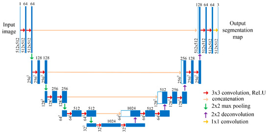 The U-Net architecture consists of a contracting path and an expansive path as shown in Figure 1. There are 23 convolutional layers in the U-Net network. The contracting path is used to extract a hierarchy of increasingly complex features from input images. The contracting path consists of the repeated application of two 3 × 3 convolutions with stride 1, each followed by a ReLU activation function and a 2 × 2 max pooling operation with stride 2 for downsampling. The number of feature channels is doubled at each downsampling step. The expansive path takes the feature representation and recovers the feature maps to the input dimensions, realizing pixel prediction in the original image. The expansive path consists of the repeated application of a 2 × 2 deconvolution which upsamples the feature maps and halves the number of feature channels, a concatenation with the correspondingly cropped feature map from the contracting path to improve the prediction accuracy, and two 3 × 3 convolutions, each followed by a ReLU. Then 64-component feature vectors can be produced after repeating these steps 4 times in the expansive path. At the final layer a 1 × 1 convolution is used to map each output feature vector to the desired number of classes. In addition, in order to ensure the size of input images and output images are same, this paper uses the U-Net network with padding, and the padding value is 1 [27].