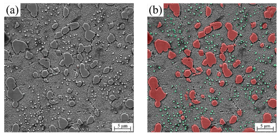 The segmented image by the U-Net model is shown in Figure 2. Red particles are primary γ’ precipitates, and green particles are secondary γ’ precipitates. Other areas are fine tertiary γ’ precipitates and γ matrix. Figure 2 shows that primary and secondary γ’ precipitates have been segmented accurately. The training accuracy is evaluated quantitatively by pixel accuracy (PA) [31], which computes the proportion of the correctly classified pixels to the total pixels. The calculate equation is expressed as Equation (5). The training process gives a high accuracy of 92.19%, and then the trained model is used to test.