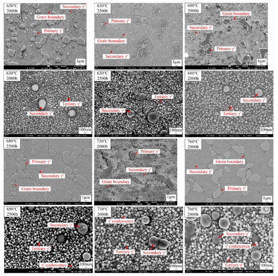 After long-term exposure for 2000 h and 2500 h at different temperatures, the γ’ morphologies are shown in Figure 4. The morphology and distribution of primary and secondary γ’ precipitates are not changed significantly, because the temperature is not high enough for the dissolution of γ’ precipitates and the long-range diffusion of alloying elements. The shape of secondary and tertiary γ’ precipitates is always spherical-like during thermal exposure, because the isotropic interfacial energy dominates over the anisotropic elastic strain energy, which contributes to maintain nearly spherical shapes. Tertiary γ’ precipitates coarsen after long-term thermal exposure because of the short-range diffusion of alloying elements at high temperature. The shape of some tertiary γ’ precipitates changes from spherical to ellipsoidal during γ’ growth, and a small amount of tertiary γ’ precipitates coalesce after 2500 h at 680 °C and after 2000 h at 730 °C, 760 °C.