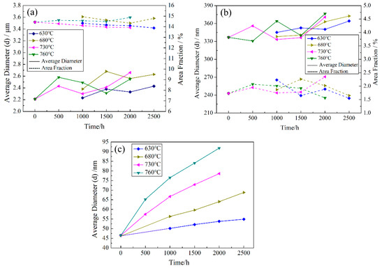 The variations of average diameter and area fraction of primary (a), secondary (b) and tertiary (c) γ’ precipitates during thermal exposure.