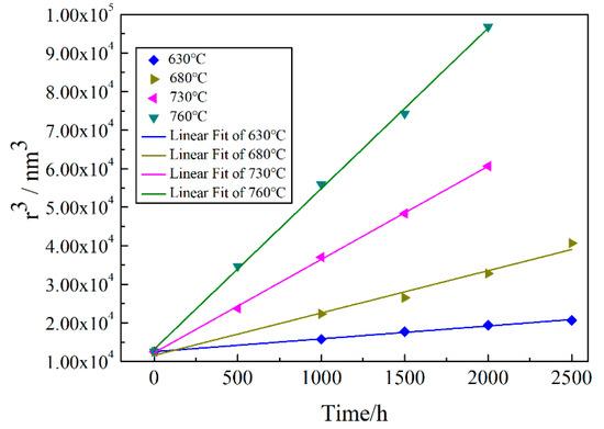 The linear fit plots of r3 vs. t of the tertiary γ’ precipitates.