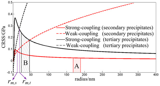 For the small γ’ precipitates, the classic precipitation strengthening models are based on the fact that dislocations pair-up to cut through the γ’ precipitates. The leading dislocation cut through the γ’ precipitates and creates the anti-phase boundary, then the trailing dislocation glides in the same plane to remove it. The size and distribution of γ’ precipitates affect the precipitation strengthening by strong coupling and by weak coupling [37,38], and it is traditionally assumed that the maximum particle strength occurs when the strong and weak pair-coupling models converge at a constant temperature. The strong and weak-pair coupling configurations are dictated when r > rm and r < rm, respectively. rm is the precipitate radius with maximum strength. The corresponding CRSS from these two mechanisms is expressed as Equations (9) and (10) respectively.