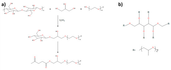(a) proposed course of the main reaction occurring as a result of liquefaction of biomass; (b) chemical structure of Rokopol®RF551.