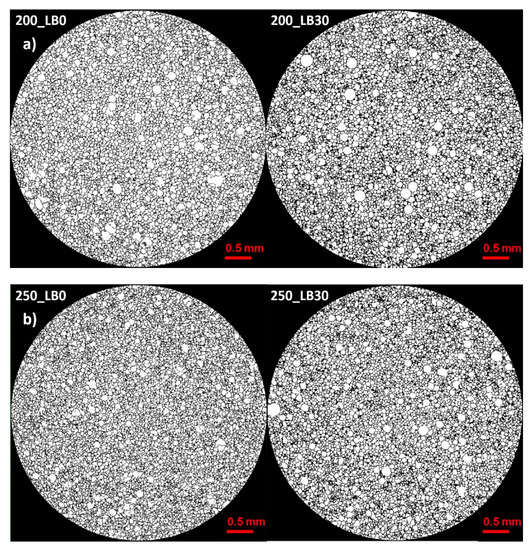 Micro-computed tomography (micro-CT or μCT) is a technique that enables three-dimensional imaging of a sample and the generation of virtual 3D models with the use of X-ray radiation. In Figure 2 are presented two-dimensional cross-sections of PUR-PIR foams prepared solely from petrochemical polyol and with a 30 wt% share of biopolyol. A slight decrease of the average cell size was noted, which could be associated with the presence of solid particles in the applied biopolyol. The applied biopolyol was obtained with 78% biomass conversion, as mentioned in our previous work [23]. Therefore, considering the applied formulations, foams with an isocyanate index of 200, 250, and 300 contained 1.8, 1.5, and 1.4 wt% of solid particles, which might act as nucleating agents, simultaneously reducing the average cell diameter. A similar effect was noted by Zhang et al. [34]. Moreover, the values of porosity are presented, which were calculated as the ratio of the total cell volume and the volume of the measured sample. It could be seen that the porosity was slightly decreasing with the addition of biopolyol, which was probably associated with the lower viscosity of biopolyol LB compared to commercial Rokopol®RF551 (see Table 1). Such an effect was related to the lower resistance of the foaming mixture to the cells’ coalescence. The more viscous polyol mixture showed a higher ability to trap gas inside [35]. The effect was very significant in the case of the work presented by Fan et al. [36]; however, they substituted conventional polyol with a viscosity of 9000 cP with a soy-based one, which showed a value of 31,351 cP. In the case of presented work, differences in the polyols’ viscosity were not so significant. A similar effect was observed in the work of Ciecierska et al. [37], who analyzed the impact of the viscosity of a polyol mixture on the cellular structure of rigid PUR foams. Their results showed that the increase of the viscosity caused an increase in the porosity, without significant changes in cell diameters. Nevertheless, such changes in morphology caused the deterioration of the mechanical performance.