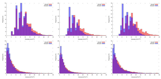 In Table 4 are presented the parameters of the foams’ cellular structure. It could be seen that the incorporation of biopolyol resulted in the reduction of the average cell diameter and volume. Moreover, the increase of IISO resulted in the enhancement of the microstructure homogeneity, which was confirmed by the decrease of the standard deviation and the sharper shape of the histograms presented in Figure 3. For all samples containing 30 wt% of biopolyol, a significant increase in the content of cells with a diameter of ~60 μm was observed. Regarding the influence of IISO, the highest homogeneity of structure and the lowest values of cell size and volume were noted for the ratio of isocyanate to hydroxyl groups equal to 250. Moreover, in Table 5 are presented 3D images showing the distribution of cells with a particular volume inside foams.