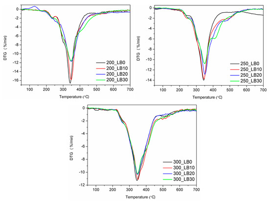 Differential thermogravimetric curves indicated the three-step decomposition process for all samples. The first step, observed at 220–280 °C, was associated with the decomposition of TCPP (degradation temperature of 224 °C), as well as the decomposition of soft segments. During the second step, with the temperature of the maximum degradation rate of 350 °C, hard segments of polyurethane were decomposed, and amines and carbon dioxide were formed [49]. For sample 250_LB30, an additional peak around 410 °C was observed, which was associated with biopolyol decomposition [32]. The third step of degradation, in the range of 430–570 °C, was related to the thermolysis of organic residues from previous steps [50]. The incorporation of synthesized biopolyol into foams’ formulations caused a shift of peaks on DTG curves towards higher temperatures, which confirmed the enhancement of thermal stability.
