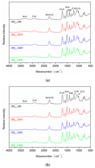 The data presented in Figure 9 indicated that the increase of the isocyanate index resulted in the increase of relative concentration of polyisocyanurate structures in foams. It could be seen that the concentrations of PUR and PIR parts of foams were strictly related to each other. Their values were strongly dependent on the isocyanate index because only when isocyanates were used in excess, a significant amount of polyisocyanurate rings could be generated. Moreover, the incorporation of biopolyol resulted in an increase of PIR content, which could partially contribute to the decrease of sol fraction content and stiffening of the material, which resulted in the rise of Tg. Although the presented results were probably different from the real ones, because, in the case of such materials like PUR-PIR foams, FTIR should not be considered as a quantitative technique, they provided exciting insight into the analysis of the obtained properties of the foams.