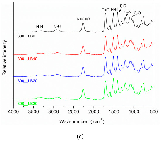FTIR spectra of PUR-PIR foams: (a) IISO = 200, (b) IISO = 250, (c) IISO = 300.