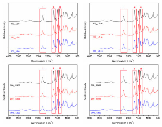 In Figure 6 is presented the impact of IISO on the FTIR spectra of prepared PUR-PIR foams. The increase of the peaks’ magnitude for vibrations of isocyanate groups, carbonyl bonds, and polyisocyanurate rings, marked as I, II, and III, respectively, was noted. As mentioned above, their intensity was noticeably increasing with the rise of IISO [56].