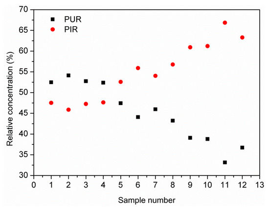 where: Cw,a is the relative concentration of Component a in the mixture; Ca is the concentration of Component a; and Cb is the concentration of Component b. In Figure 9 are presented the relative concentrations of PUR and PIR for the analyzed foams. Samples 1–4 were foams obtained with IISO equal to 200 with biopolyol content from 0 to 30 wt%, while Samples 5–8 and 9–12 were obtained with IISO of 250 and 300, respectively.