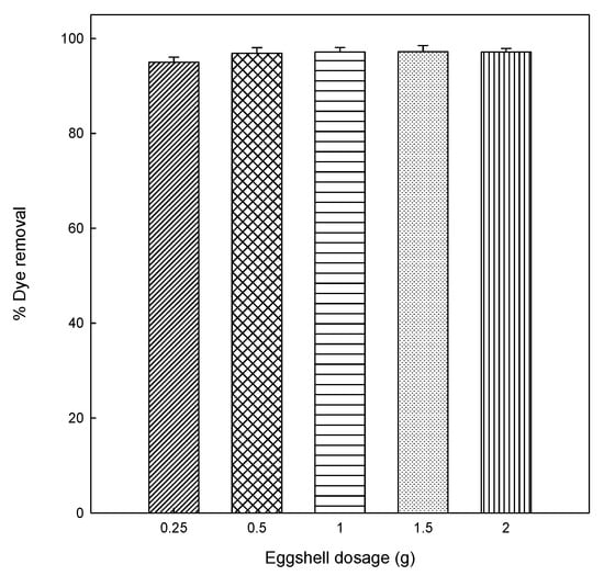 Different amounts of eggshell (0.25, 0.5, 1.0, 1.5, and 2.0 g) were added into DB78 solutions to analyze the effect of adsorbent dosage on adsorption. The effect was investigated at an initial concentration of 25 mg/L, pH 5, 120 min of contact time, constant stir (500 rpm), and room temperature (25 °C). The results obtained from this study are shown in the plot of dye removal (%) versus adsorbent dosage (g), as can be seen from Figure 1.