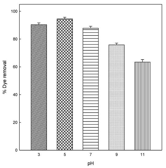 As shown in Figure 2, the removal efficiency of dye increased at acidic pHs (3 and 5). From this pH, the adsorption capability of the eggshell decrease from 94.5% to 63.4% at pH 11. Figure 2 shows that the optimum pH required to obtain the maximum adsorption of DB78 onto eggshell is 5. The isoelectric point for the eggshell is 5.5 [44], which is close to our optimum pH (5.0). At this pH, the adsorbent is positively charged and interacts effectively with the negative charges in DB78. This trend was similar in the removal of Direct Red 80 and Acid Blue 25 dyes from aqueous solutions on eggshell membrane, in which the adsorption capacities of both anionic dyes onto eggshell membrane increased with acidic pHs [9] and, in another study, Chojnacka carried out the biosorption of Cr (III) ions from aqueous solutions by eggshells at pH 5 [45].