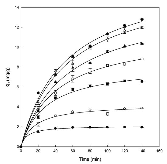 Different adsorption stages can be differentiated in the range of concentrations analyzed (25–300 mg/L). At a low concentration (25 mg/L), the equilibrium was reached after 40 min of contact. The adsorption was fast at the concentration of 100 mg/L, however, it was slower than at low concentrations, reaching the equilibrium after 80 min of contact time. At high concentrations of dye (>100 mg/L), the curves did not present the asymptotic form. Hence, the equilibrium time increased with increasing concentrations of DB78 (from 150 to 300 mg/L).