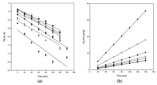 The Lagergren’s equation for pseudo-first-order kinetics is given by the following Equation (2) [30]: