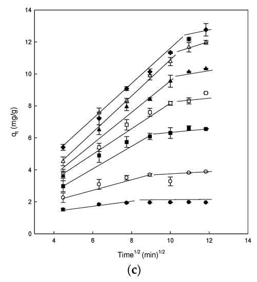 where qt is the adsorption capacity at any time t (mg/g); and ki is the rate constant of this model (mg/g min1/2) and its values can be calculated from the slopes of plots qt versus t1/2, where t is the time (min) and C is the intercept (mg/g).