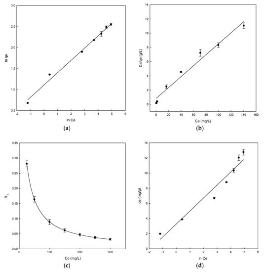 The Temkin formula determines that the decrease of adsorption heat with coverage is linear because of some adsorbate/adsorbent interactions. The adsorption is characterized by uniform distribution of bond energies, up to a maximum bond energy [41]. The linear form of Temkin isotherm’s equation can be expressed as Equation (8), as follows: