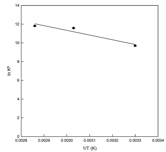 To confirm the results for the Gibbs free energy, the Van’t Hoff [12] equation was graphed (lnK° vs. 1/T). Plotting lnK° versus 1/T gives a straight line with slope and intercept equal to −ΔH°/RT and ΔS°/R, respectively, where R is the universal gas constant (8.314 J/mol K) and T is the absolute temperature in Kelvin (K). Using this representation, the Gibbs free energy was calculated again using the following equation: