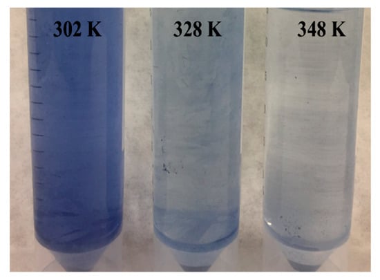 As stated before, the thermodynamic analysis revealed that, at 29 °C, there was not an increase in the adsorption abilities of eggshell, however, the best conditions to entrap the dye were achieved at 75 °C. At this temperature, the ability of the adsorbent to adsorb more dye molecules increased, as can be observed in Figure 7.