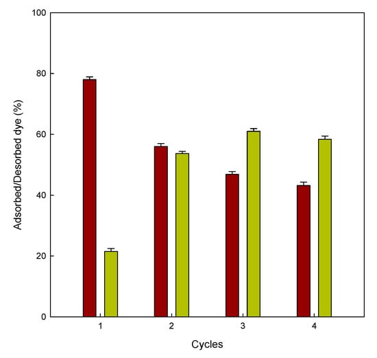 This adsorption/desorption cycle was repeated four times (Figure 8); according to the results observed, the adsorption abilities of the eggshell decreased with the increasing the number of cycles. This trend was the opposite for the desorption experiments. The results confirm that the eggshell can be reused in different cycles of adsorption/desorption.