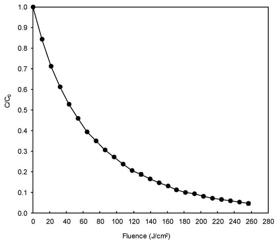 where C is the concentration at fluence F (J/cm2), C0 is the initial concentration, and k is the pseudo-first order rate constant (cm2/J). Data were processed using Excel 2010 (Microsoft, Redmond, WA, USA).