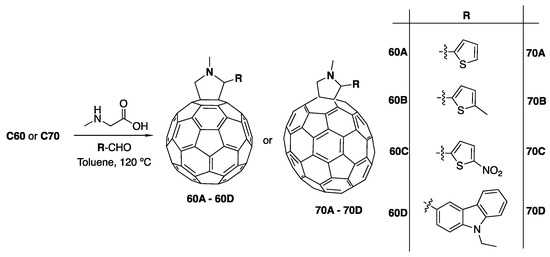 Fulleropyrrolidines 60A to 60D were synthesized using the 1,3-dipolar cycloaddition of the corresponding thiophene and carbazole aldehydes and C60, with N-methylglycine and paraformaldehyde in toluene under reflux. After purification by column chromatography on silica gel compounds 60A to 60D were obtained in around 40% yield. 70A to 70D were prepared in the same manner replacing C60 with C70. The final structures were confirmed by 1H NMR with spectroscopy assignments supported by 2D-H experiments.