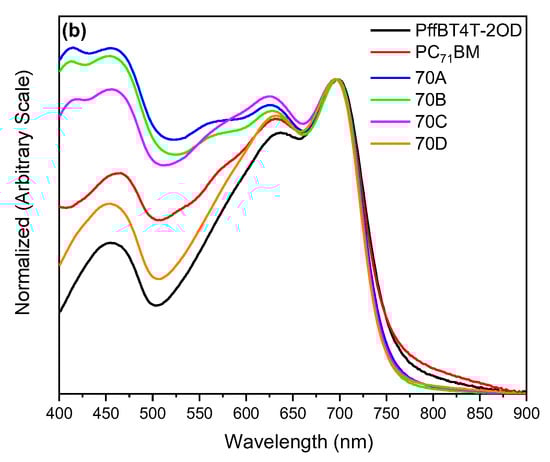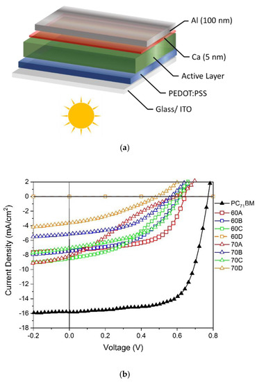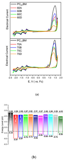 The cyclic voltammograms of the eight synthesized fulleropyrrolidine acceptors, as well as the voltammograms of the corresponding PC61BM and PC71BM references are shown in Figure 2a. The corresponding HOMO/LUMO levels determined from these voltammograms are shown in Table S1 in Supplementary Information and represented in Figure 2b. Also represented in Figure 2b are the HOMO/LUMO levels of the polymer, from the literature [10]. The HOMO/LUMO levels that we have determined for PC61BM and PC71BM are in excellent agreement with literature [56,57] which attests the reliability of our measurements for the fulleropyrrolidine acceptors. The fulleropyrrolidines 60A, 60B, 70A, and 70B have slightly higher LUMO levels than the PC71BM standard which should favor higher VOC and PCE values assuming that all other factors remain unchanged.
