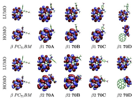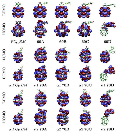 The DFT computed HOMO and LUMO energies show a moderate agreement with the experimental values, Table 2. The LUMO energies show the best agreement, with differences up to 0.17 and 0.28 eV for 70C and 70D respectively. For C70, α1 and α2 diastereoisomers generally yield very similar frontier orbital energies with the exception of α1-70D and α2-70D HOMOs which differ by 0.08 eV. Also, the β1 and β2 HOMO and LUMO energies are very similar. Remarkably, when α and β C70 isomers are systematically compared, HOMOs show lower energies, while LUMOs show higher energies. Thus, all α isomers have larger HOMO-LUMO gaps than β isomers. Figure 3 shows the electron density for both frontier orbitals for all molecules. The HOMO orbitals are localized on the carbazole moiety for 60D and 70D structures. In all the other cases, the HOMO electron sit predominantly on the fullerene part, although for some systems—namely 60A, α-70A, α-70B, and β2-70B—some density is also found on the functional groups. Interestingly, the LUMO orbitals, associated with the capacity of these molecules to act as electron acceptors, reside on the fullerene for all structures.