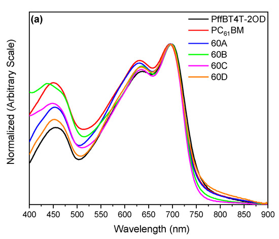 Figure 4 shows the UV–vis spectra of the blends and pure polymer, normalized to the intensity of their 0–1 transition peak at ~700 nm. As expected, considering the absorption spectra of the individual fullerenes shown in Figure S26, the BHJs with C70-fulleropyrrolidines exhibit a stronger light absorption in the range 400–700 nm than the corresponding BHJs with C60-fulleropyrrolidines.