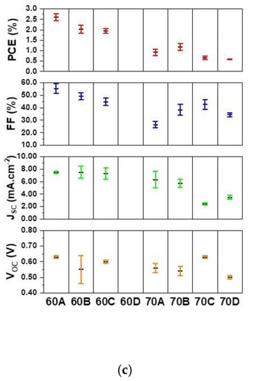 The experimental J–V data was fitted, using genetic algorithms, to the OPV equivalent circuit [66]. The most relevant simulated J–V curves are displayed in Figure 6 and the full simulated data is presented in Table 4, namely the simulated values of Jph, Rs and Rp. Analysis of our data shows that there is no obvious relationship between the VOC values obtained and the energy level differences, as determined by cyclic voltammetry, although for samples 60A and 60B some trend was observed (as previous indicated and expected). This means that locally defined energy levels, arising from structural defects and/or inhomogeneous film formation, need to be taken into consideration. In fact, as previous work has shown, energetic disorder at D:A interphase can contribute for changing significantly the VOC values and this should be also occurring in the present work. The equivalent circuit Rp (modelling physical electrical carrier’s loss) helps, in some way, to support this hypothesis: higher Rp corresponds in general to effectively higher η. Moreover, and besides these factors influencing VOC, a decrease of Rp usually leads to a decrease of VOC (equivalent circuit) and in general this behavior is observed, namely with samples 60A, 60B, and 60C and with samples 70B, 70C, and 70D. However, we must take into account that we are comparing different samples (structure, LUMO/HOMO levels, and solubility) and therefore specific considerations for each of them should be also considered.
