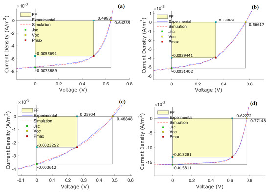Experimental (solid lines) and simulated (dashed lines) J–V curves for OPVs based in donors (a) 60A, (b) 60C, (c) 70C, and (d) PC71BM.