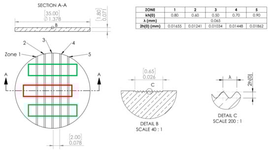 Target geometry with multiple surface perturbations on the copper sample used for the gun-drive experiments. The red region represents the area implanted with helium, whereas the green area shows the region used to extract data corresponding to unimplanted copper. Please note that the dimensions on the actual drawing are in inches with mm in square brackets.