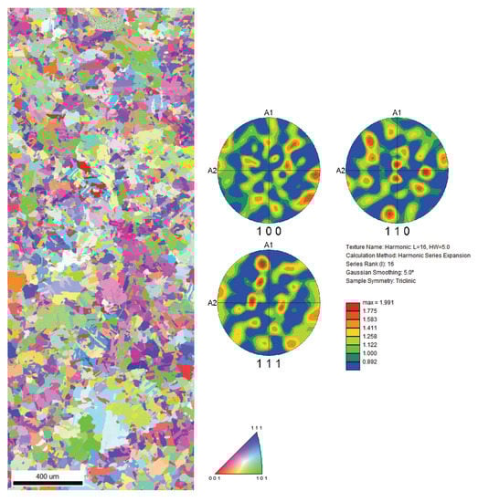 To preserve the reflecting surfaces of the RMI targets, characterization specimens were collected from surrogate copper samples prepared from the same plate and implanted under the same conditions as the targets. Standard metallographic techniques were used to prepare samples for EBSD analysis in a FEI Inspect scanning electron microscope (SEM) (Hillsboro, OR, USA). A final polish of m AlO was followed by an electrochemical polish in a 2:1 solution of phosphoric acid and water at 1.9 V for 30–40 s. The samples were then lightly etched using a solution of FeCl and HCl. Surface preparations were completed prior to any implantations. Post-implantation grain sizes (60 m) and textures (random) were found to be similar to unimplanted copper [12], as shown in Figure 2.