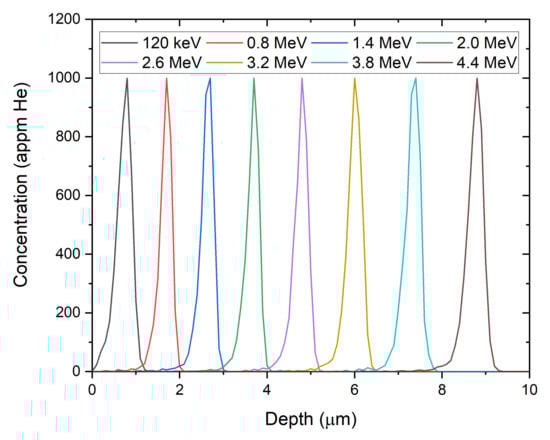 The formation of helium bubbles in these samples is to be expected, given the favorable trapping of excess point defects at dissolved helium atoms and the suppressive effect of helium on the critical radii for cavity growth [13]. The authors acknowledge, however, that helium was not introduced homogeneously by the implantation method used here, instead concentrating in bands around the peak ion ranges of each implantation energy. Implantation profiles for each ion energy were simulated using Stopping and Range of Ions in Matter (SRIM) [14] and are shown in Figure 4. With the low diffusivity of helium in copper near room temperature, this leads to a nonuniform distribution of helium bubbles with depth. Future studies on the effects of helium distribution will incorporate ion-energy-degradation techniques to allow for more uniform implantation of helium at elevated temperature.