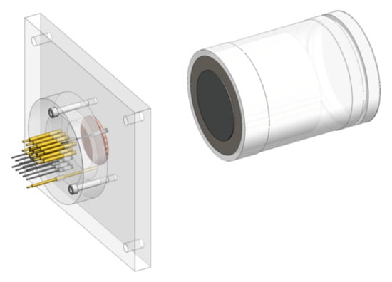 The diagnostics package was mounted on the back of the lexan plate, such that it could cover the rear of the sample where the perturbations were located. This consisted of a round disc with rows of holes to mount either photon Doppler velocimetry (PDV) probes or lithium niobate (LN) pins. The former are used to measure velocity through a noncontact-laser-based interferometric technique. A narrow linewidth laser is used to illuminate the target, and the reflected light is collected by the probe. If the target surface is moving, this reflected light is Doppler shifted. The collected light is mixed with a reference source, producing a beat frequency that is proportional to the surface velocity. Fourier transform techniques are used to extract the velocity-time history. With a sufficiently high-bandwidth oscilloscope, PDV can resolve velocities from rest to 104 m/s with excellent dynamic range. PDV is able to resolve multiple velocities in the field of view at once, hence it is ideally suited to RMI work, where we want to measure the velocities of the ejecta, bubble, and bulk surface. The probes were supplied by AC photonics, part number 1CL15P020LCD01. These are collimating probes with a spot size of approximately 300 m at a 20-mm distance, as such, each probe captures multiple wavelengths of the perturbation region it is interrogating.
