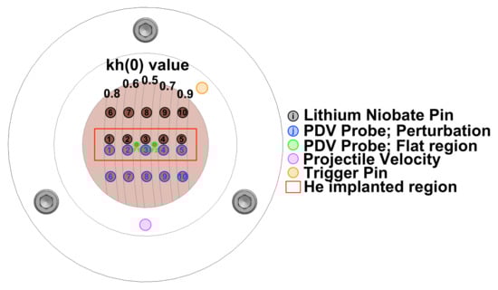 A diagram of the diagnostics package is shown in Figure 6. For each perturbation, there was one PDV probe and one LN pin in both the helium-implanted and -unimplanted regions. There were also two PDV probes on the flat regions, one between kh values of 0.6 and 0.5 and the other between kh values of 0.5 and 0.7, to provide a breakout time and the jump-off free surface velocity. A PDV probe was placed looking through the entire target assembly (magenta circle in Figure 6) to measure the projectile velocity. Similarly, another piezoelectric probe (orange circle, Figure 6) was glued onto the lexan plate to provide a voltage spike at target impact to trigger all of the diagnostics. The alignment of the PDV probes to the perturbations was checked with a red laser, to allow visible confirmation of the spot on the desired region. The standoff height—the distance from the rear of the target to the front face of the LN pins and PDV probes—was measured to be 22 mm for all targets. Images of the rear of the mounted target, the diagnostics package, and the full target assembly mounted in the gas gun are shown in Figure 7.