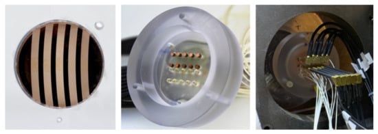 Images showing left—rear of the target mounted in the lexan plate, center—back of the diagnostics package showing the LN pins (top two rows) and PDV probes (bottom two rows), right—rear of the target and diagnostics assembly mounted in the gas gun.