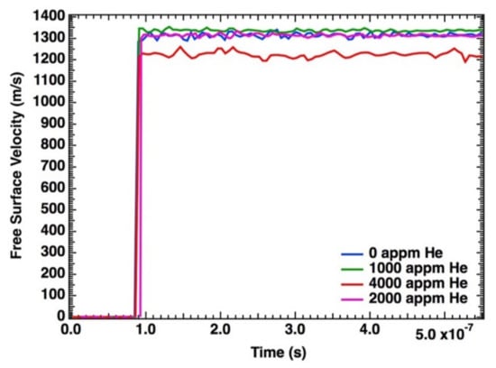 The four experiments were performed; three at an impact velocity of 1.1 mm/s (0, 1000, and 2000 appm) and one at 1.0 mm/s (4000 appm). The velocity–time histories corresponding to these experiments are shown in Figure 8. This data shows the breakout velocities to be ~1.3 km/s for the three samples (0, 1000, and 2000 appm) and 1.2 km/s for the 4000-appm copper.