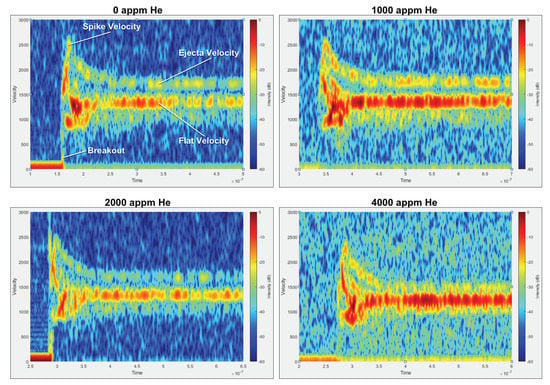 Spectrograms corresponding to copper with (top-left) 0 appm, (top-right) 1000 appm, (bottom-left) 2000 appm, and (bottom-right) 4000 appm helium.The spectrograms are colored by intensity, which varies between experiments depending on the signal to noise ratio for that particular experiment.