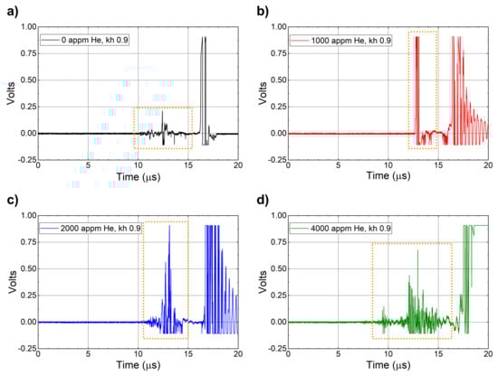 Voltage–time history corresponding to (a) 0 ppm, (b) 1000 ppm, (c) 2000 ppm, and (d) 4000 ppm for the four shots obtained from LN pins placed at a kh of 0.9. The dotted boxes outline the beginning and start times associated with ejecta at the LN pins. The late time signal is attributed to the free surface of the copper impacting the LN pins.