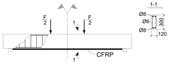 Geometry of the reinforced concrete beam strengthened with externally bonded CFRP and subjected to four-point bending test.