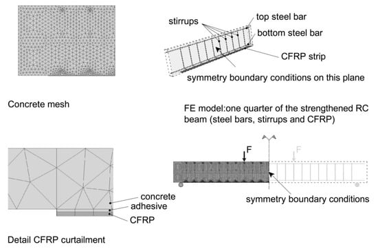 With the hypothesis that the global response of the composite structural element is influenced mainly by the failure behavior of concrete, a finer mesh is generated for concrete. Additionally, the finite element size should comply with the requirements of the representative volume element size derived based on the energy balance in the framework of the continuum damage mechanics [53]. The sizes of the finite elements generated for CFRP reinforcement, the adhesive layer, and the steel reinforcement is defined so that a coherent mesh is obtained (i.e., smooth transitions between regions of different finite element sizes). Details on the generated finite element mesh, displayed in Figure 6, are summarized in Table 3.