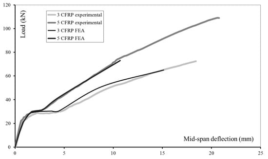Figure 7 shows experimental results and results obtained by finite element analysis. The numerical models reproduce the geometry, the reinforcement arrangement, and the material properties of experimentally-tested beams [45]. From the experimental data available, for finite element simulations are selected the beams strengthened with three and five layers of CFRP. As shown in Figure 7, such a difference in the amount of the externally bonded reinforcement illustrates well the effects of synergy in the composite structural element.