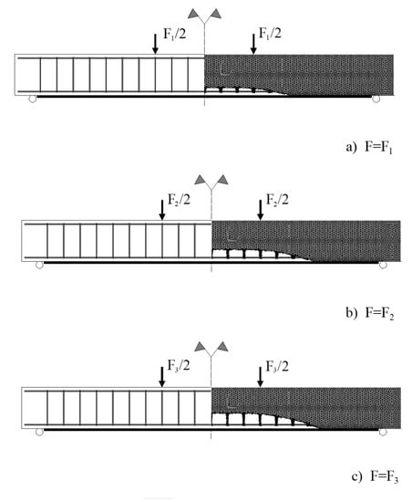 The strategy chosen to simulate the strain-softening concrete response, see Equations (6)–(8), involves the calculation of damage variable for each increment of the driving force parameter and for each finite element used to model concrete. Technically, the calculated damage variables are stored in predefined arrays. This algorithm makes possible the simulation of the initiation and propagation of the damage in an initially undamaged, homogeneous, and isotropic medium. In Figure 8, the propagation of the damaged zone in concrete is visualized. For three consecutive values of the applied load (F1 < F2 < F3), finite elements of a particular degree of mechanical damage are not displayed. Damage is initiated in the vicinity of the mid-span of the strengthened beam and propagates towards the supports.