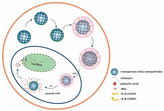 Recently, various chemotherapeutics have been exploited for effective cancer treatments. However, traditional therapeutic drugs show significant adverse effects on healthy organs. Nano-drugs have controlled release or targeting, which may alleviate the serious side effects of cytotoxic chemotherapeutic drugs to a certain extent [1,2,3,4]. Mesoporous materials have an ordered pore structure and a high specific surface area, which can provide a structure capable of accommodating a large number of drugs [5]. On the other hand, an ordered pore network can appropriately control the loading and release of drugs. These advantages have attracted attention in the field of application of drug delivery systems (DDS) [6,7]. Among various mesoporous materials [8,9,10], the unique mesopore structures [11] and facile surface functional properties [12,13] of mesoporous silica nanoparticles (MSN) make it feasible for use in the design of diverse stimuli-responsive gatekeepers. These structures control the opening and closing of the mesopores for a triggered release of drugs loaded inside the porous particles [14,15]. So far, several materials, such as inorganic nanoparticles [16,17], dendrimers [18,19], rotaxane [20], cyclodextrin [21] and DNA [22] have been applied to cap the mesoporous openings on the surface of MSN. These materials permit different external triggering motifs such as redox state changes [23], pH [24], temperature [25], illumination [26], enzyme activity [27] and so on to achieve a controlled release of guest drugs from the pores. However, the side effects of these cancer therapeutics cannot be ignored in clinical practice [28]. Therefore, there is an urgent need to develop effective stimuli-responsive nanocarriers to improve targeted drug release.